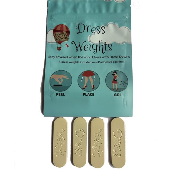 Keeping your garments down and your body covered Dress Weights, garment weight is the first reusable and discreet fashion fix to help you avoid a windy wardrobe malfunction. Simply peel the 3m Tape backing, press the weight along the hem, and go! Allowing for a peace of mind as you go about your day or night.
